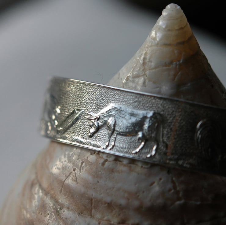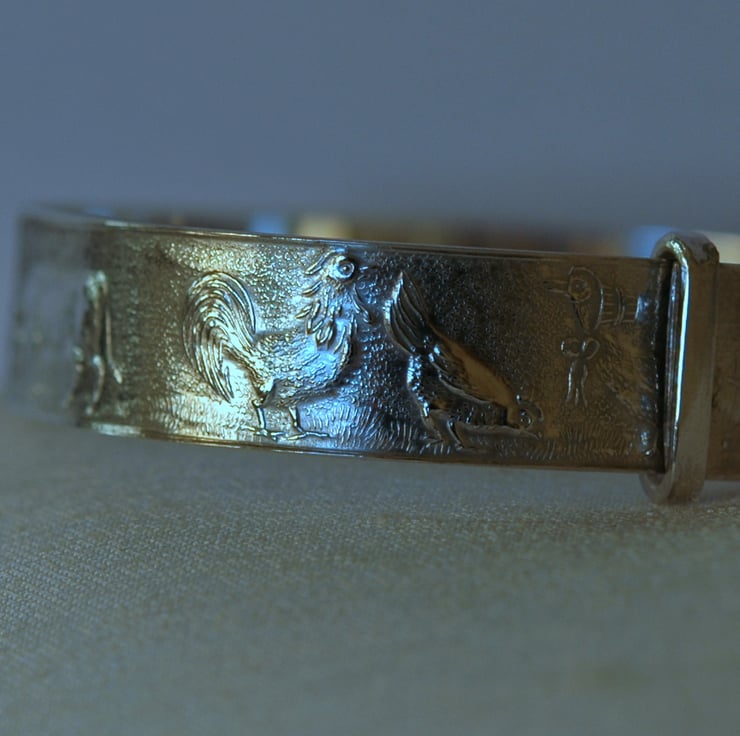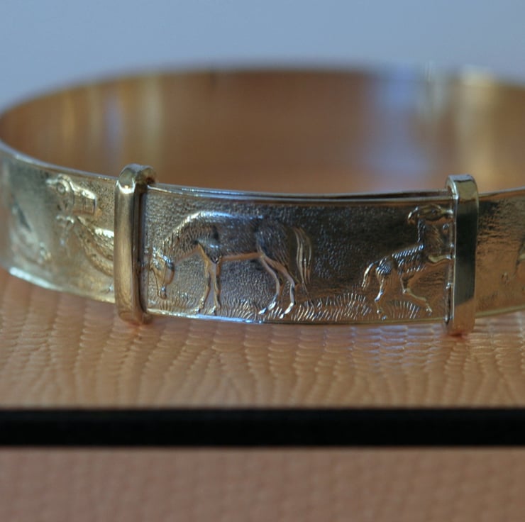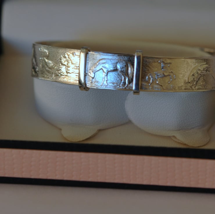 This unusual sterling silver bracelet is made from a pattern wire imprinted with a farm animal motif. The selection of animals includes a horse, cattle, dog, pig, rabbit, ducks and chickens, plus Mother Goose complete with bonnet! It would make a lovely christening present or gift for a toddler or an older child. It is 1cm wide and the diameter is about 5 cm, but it is adjustable and the sample shown will fit the wrists of most children in the age range 4-10 years. When outgrown, it is an easy matter to remove the guide loops and convert it into an open cuff bracelet which will fit adult wrists.