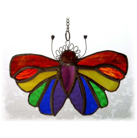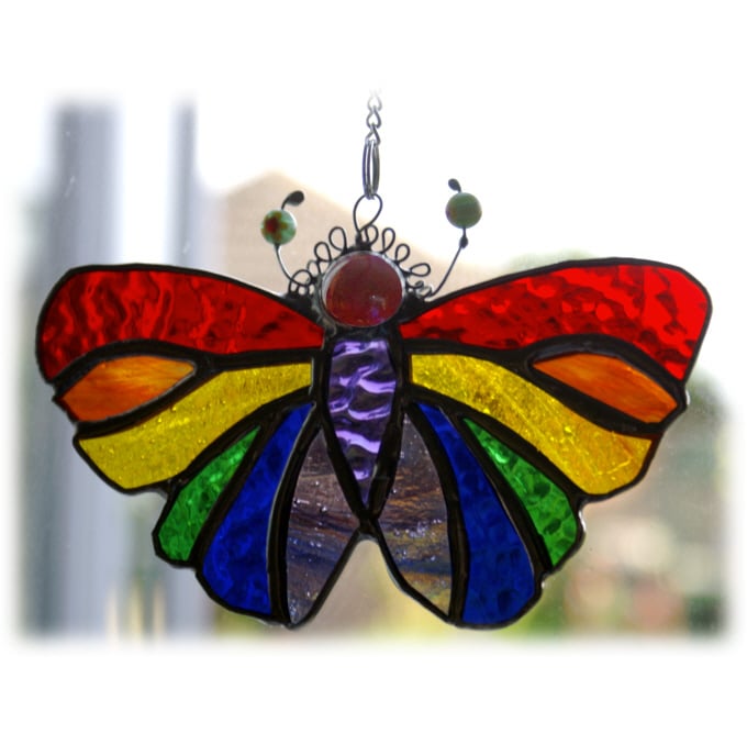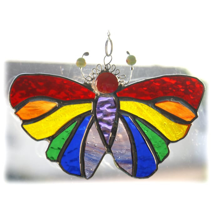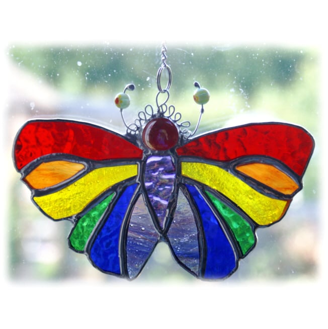 It is a beautiful rainbow butterfly made with glass of all the colours of the rainbow. I've used some textured , some streaky and some iridescent glass so it has lots of shine and movement.