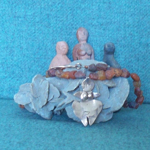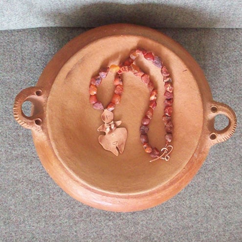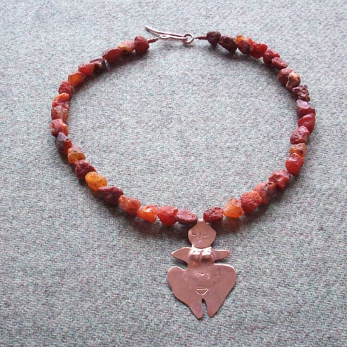 This piece is inspired by Mother Goddess figurines like the Earth Mother of Willendorf. Another connection to the past is copper, the first metal humanity would have used as it occurs naturally in workable nuggests. This necklace comprises rough unpolished chunks of carnelian to enhance the ancient feeling. The techniques include hammering stamping and forging, all hand made including the copper hook and loop. Comes to you in a gift bag with maker logo. Please contact me for multiple and non-UK postings as rates vary.