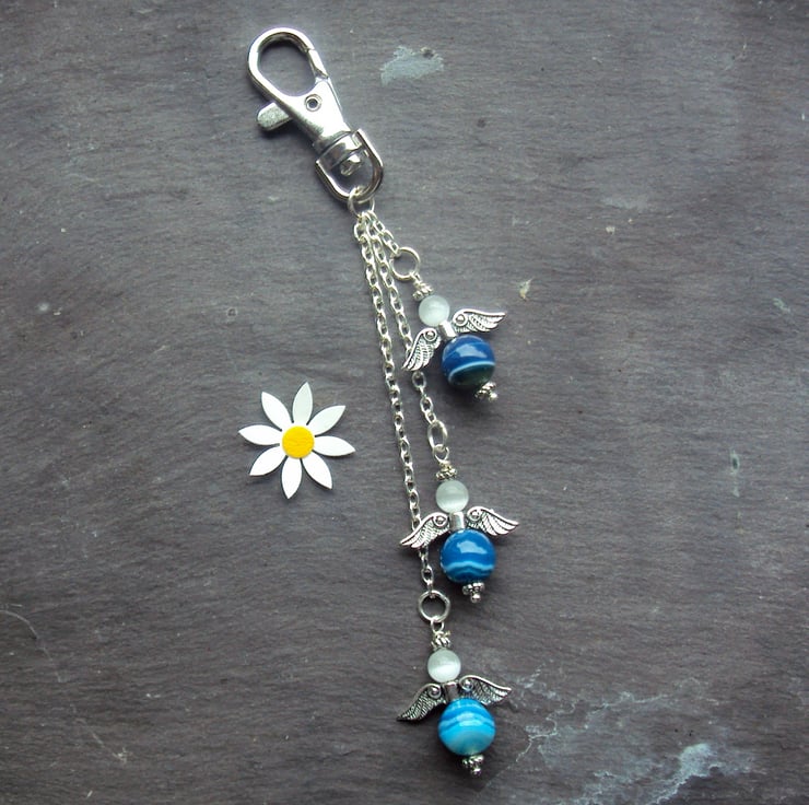 Silvery bag charm with three 10mm blue agate angels with silvery wings flying from link chains. The charm is finished off with a matching clasp.