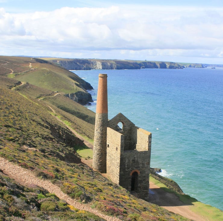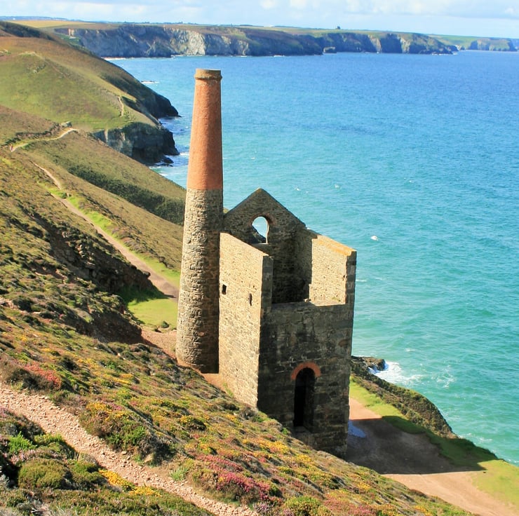 Wheal Coates tin mine with a well known engine house called Towanroath, perched on a cliff above a Cornish beach.