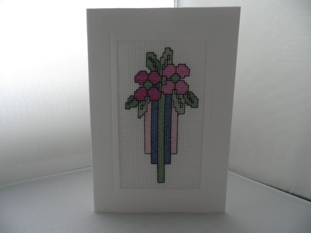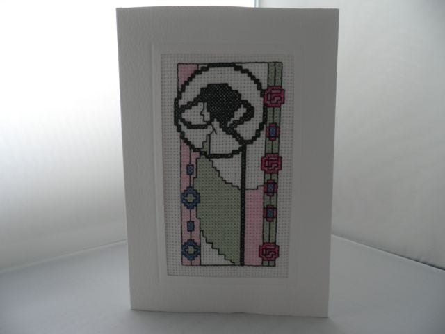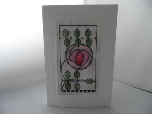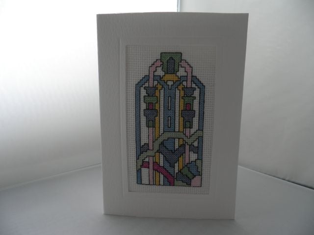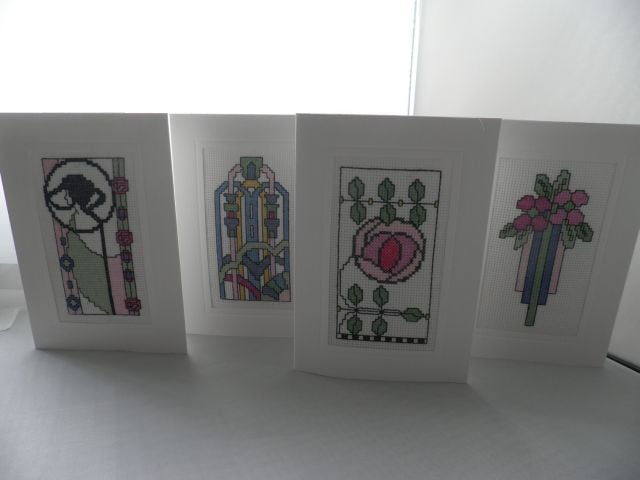 A set of 4 cross stitched cards measuring 6 x 4 inches featuring an art deco style bouquet, window, lady and rose, the stitched aida is in a 3 fold white textured aperture card, wadding has been placed behind the stitching to give a lovely padded effect.