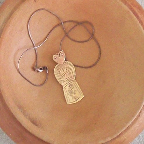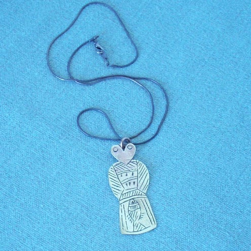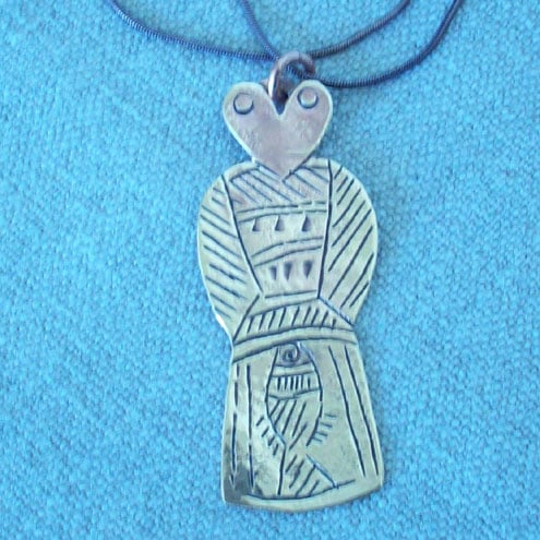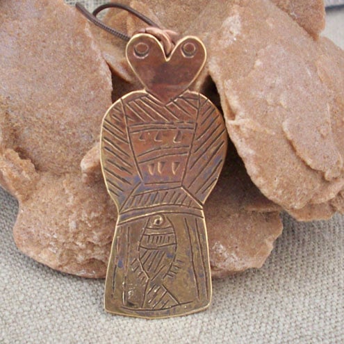 This piece is inspired by a painted amphora from the seventh century BCE. The female figure is surrounded by birds and beasts, with a fish on her skirt. The design is stamped with my own hand-made stamps. Strung on a brown woven cotton thong. Comes to you in a gift bag with designer logo label. Please contact me for multiple and non-UK postage as rates vary.