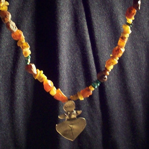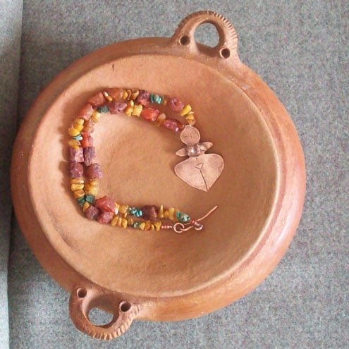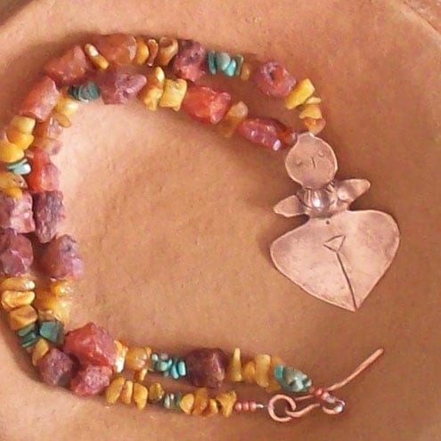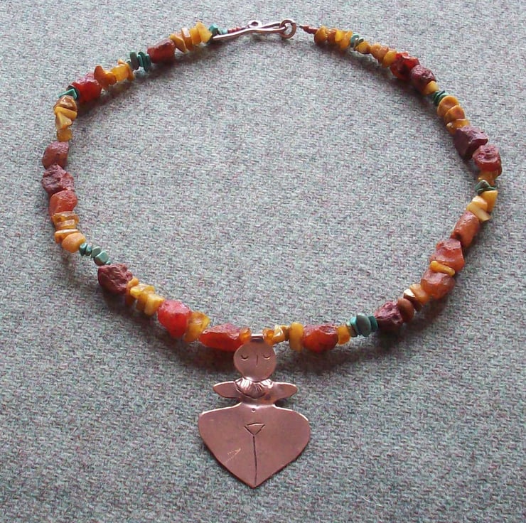 This necklace harks back to an earlier time when, it is believed, there was a peaceful agrarian culture revering the Female Principle. Another connection to the past is the copper, the first metal humanity would have used as it occurs in workable nuggets. The Mother Goddess is depicted with a sunray necklace and hangs on a string of rough unpolished chunks of charnelian, amber and turquoise to enhance the ancient feeling. The techniques include hammering, repousse and stamping with my own handmade stamps, all handmade including the copper hook and loop fastening. Comes to you in a gift bag with designer logo label. Please contact me for multiple and non-UK postage as rates vary.