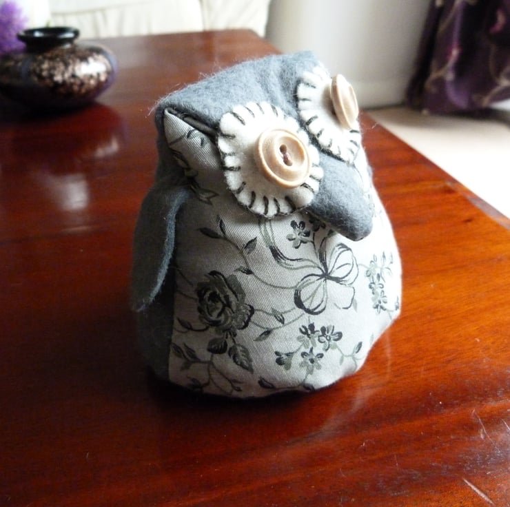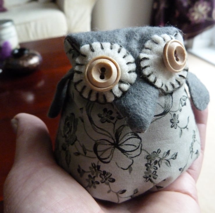 A very cute baby owl completely handmade from 100% cotton fabric and felt. The body has been machine stitched for added security as it is filled with dried pulses. Eyes are cut out from felt as are the wings. Eyes embellished with wooden buttons.