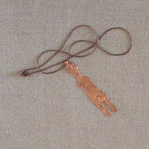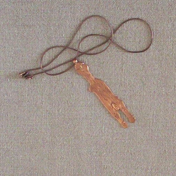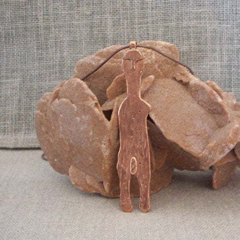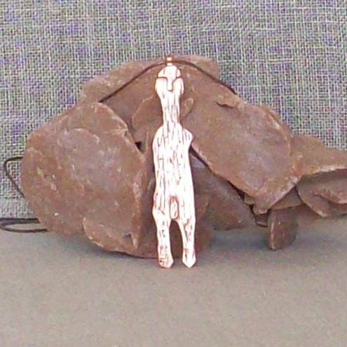 This piece is based on one of my favourite objects from the Royal albert Memorial Museum in Exeter, Devon, where I spent many happy hours volunteering and working. The oak original, some 13 inches high dates from the Bronze Age and was found at Kingsteignton. There is a theory that it depicts the Norse God Thor. It's a precious find as so little wood survives in damp Britain. Imagine my surprise when I went round the corner at Archaeon in Holland (a fabulous archaelogical theme park - DO GO) and came face to face with a 6 foot wooden replica! I've textured the copper to resemble the wood grain. Strung on a brown woven cotton thong. Comes to you in a gift bag with designer logo label. Please contact me for prices for multiple and non-UK posting, as rates vary.