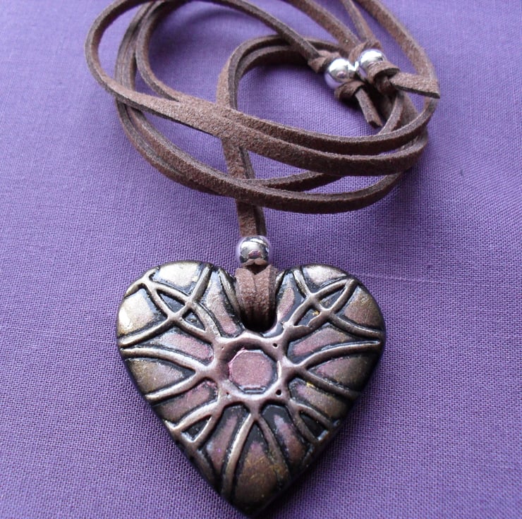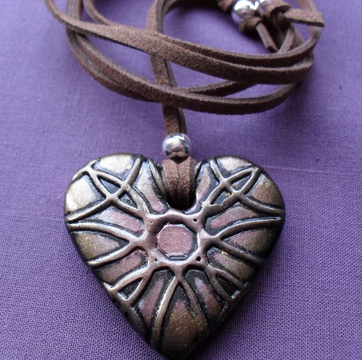 Black polymer clay which has a textured pattern, and a bronze and gold tone applied with mica powder which gives a metallic finish. Pendant has a polymer clay glaze and attached to a faux suede cord with a silver plated bead and two silver plated beads at the end of the cord.