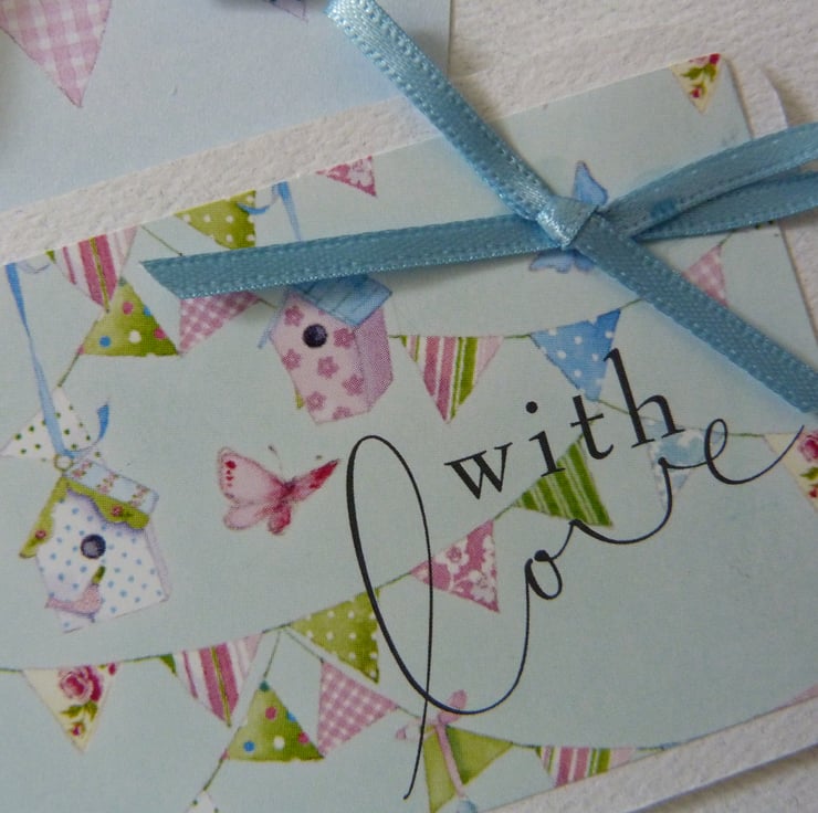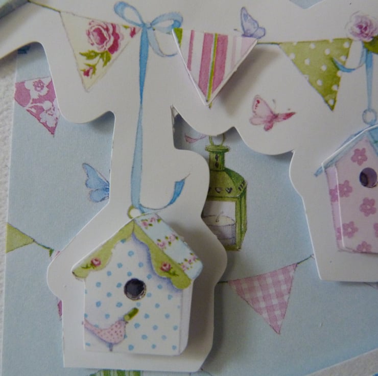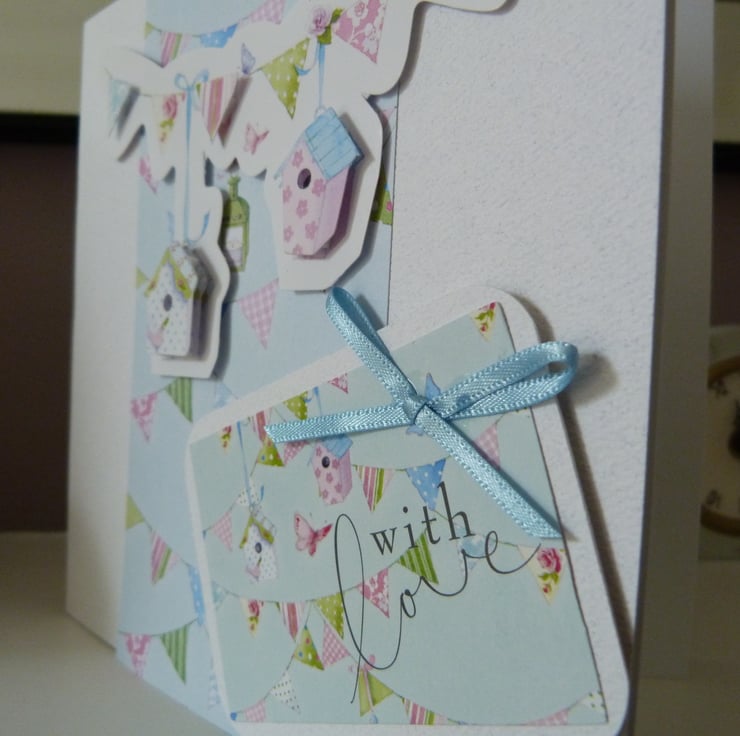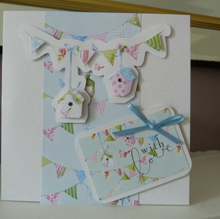 A very pretty decoupaged design of two birdhouses hanging from a row of bunting, mounted onto co-ordinating bunting paper and then onto quality textured white card. Finished off with a with love tag and pretty pale blue ribbon bow.