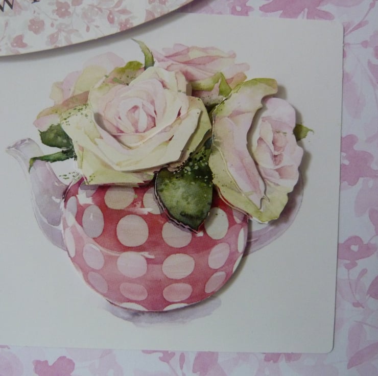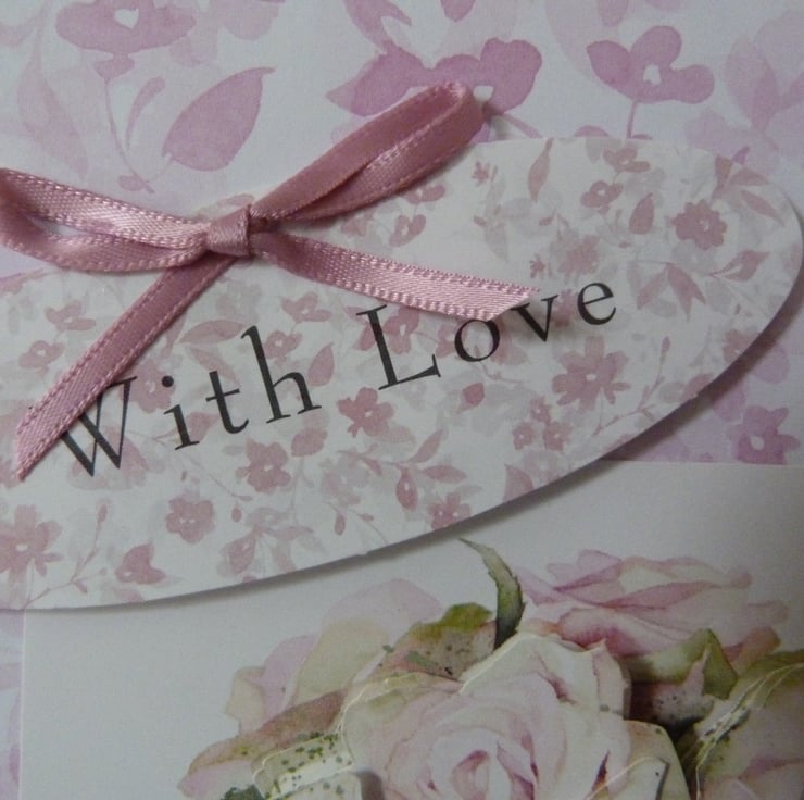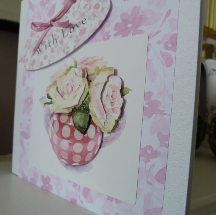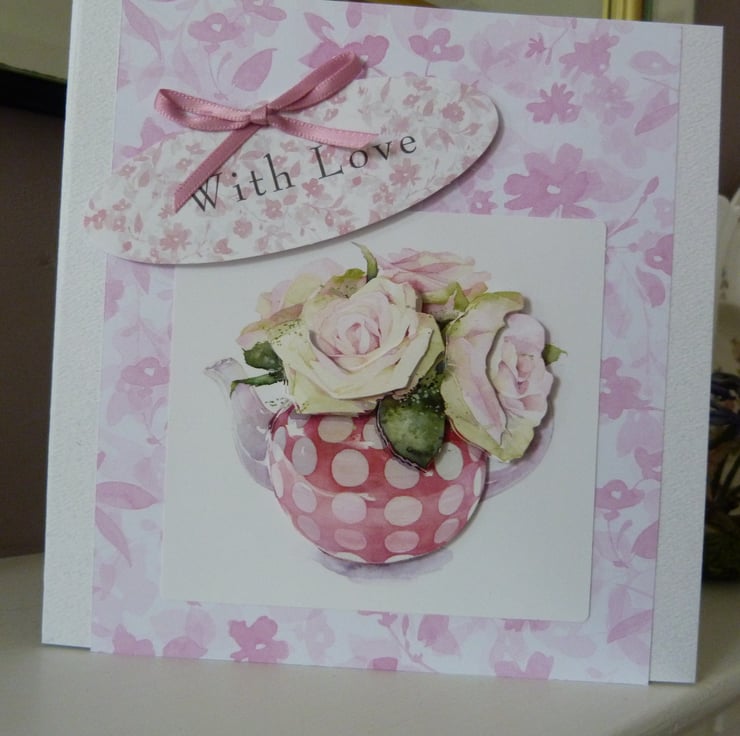 A pretty decoupaged teapot filled with pastel roses mounted onto quality pink co-ordinating floral paper then mounted onto quality textured white card. Finished off with a with love banner and pale pink ribbon bow.
