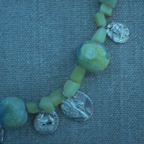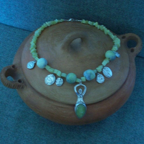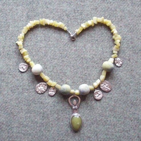 My "Goddess" necklaces hark back to an earlier time when, it is believed there was a peaceful agrarian culture revering the Female Principle. This necklace has a central Goddess pendant set with Prehineite, strung on jade with big matte serpentine beads. The pendant is 925 Sterling Siver hallmarked and the six Celtic patterned charms are in 99% pure silver hallmarked. Sterling silver caribiner fastening. Comes to you in a gift box. Please contact me for multiple and non-UK postage as rates vary.