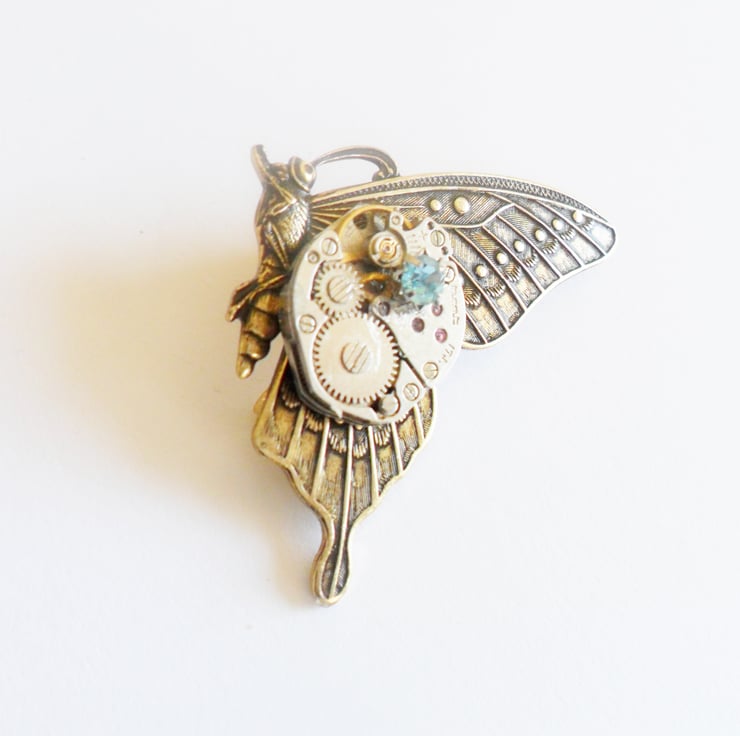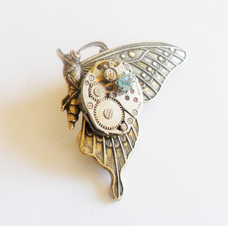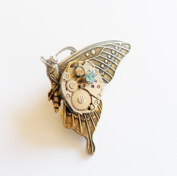 A lovely intricate antiqued gold tone butterfly base has been joined with a Vintage watch movement to create this stylish brooch... the elegant in harmony with the unusual.