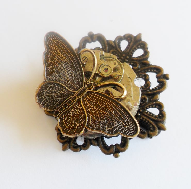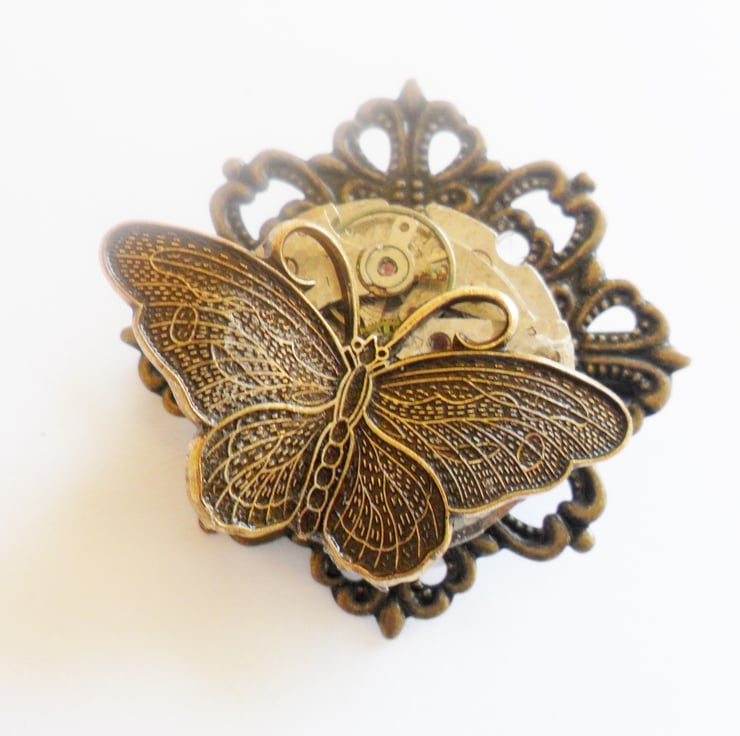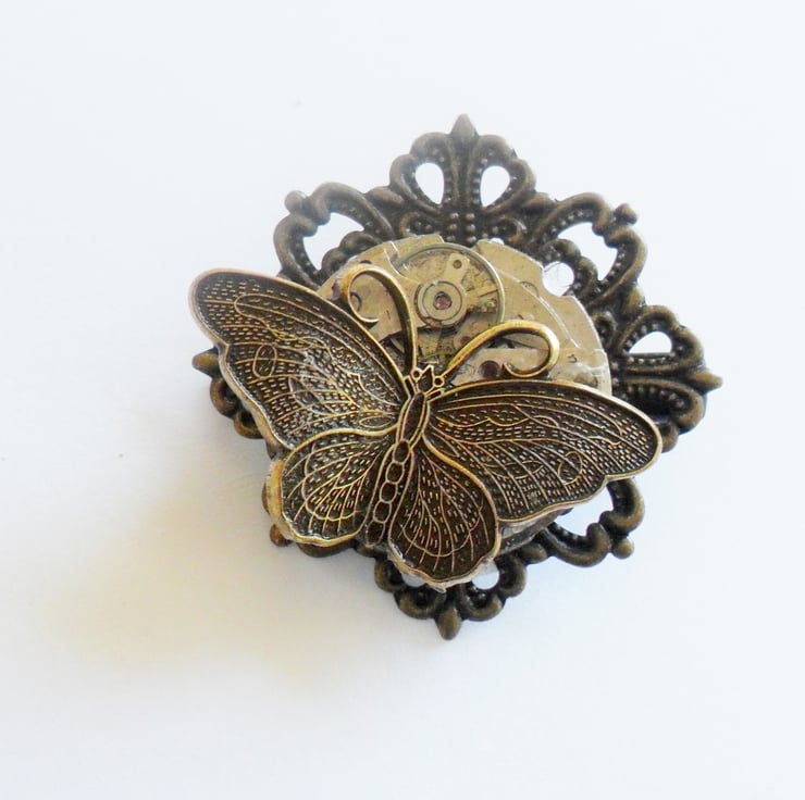 I have created this feminine, one of a kind Steampunk hair grip by adorning an antiqued filigree base with a beautiful vintage watch movement, a detailed butterfly in flight adds the touch of the whimsical.