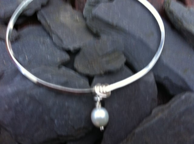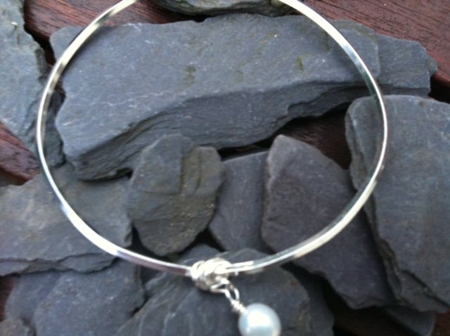 Sterling silver bangle made from square sterling silver wire. I have added an 8mm ivory freshwater pearl charm