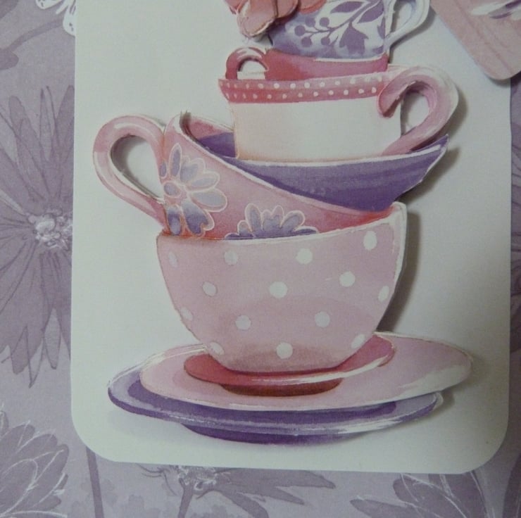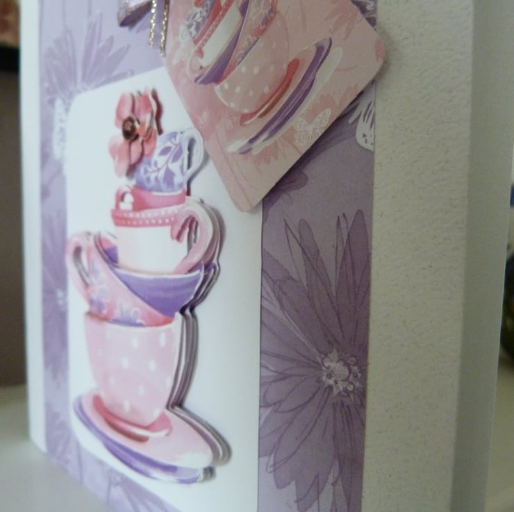 A pretty stack of china cups and saucers decoupaged onto pretty lilac floral paper then mounted onto quality white textured card. A co-ordinating tag with lots of love, further embellished with silver edged lilac ribbon bow.
