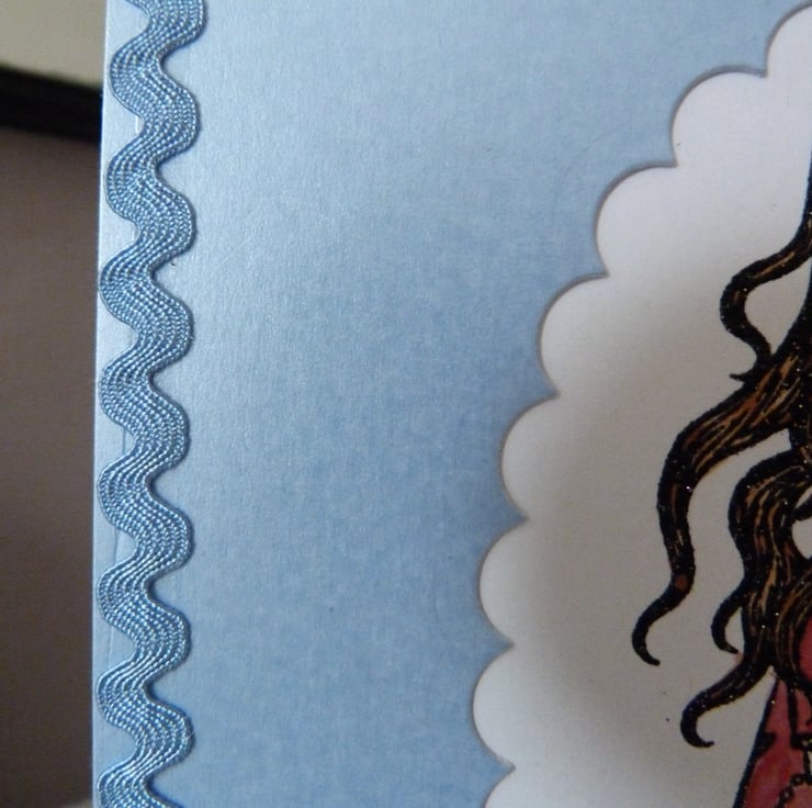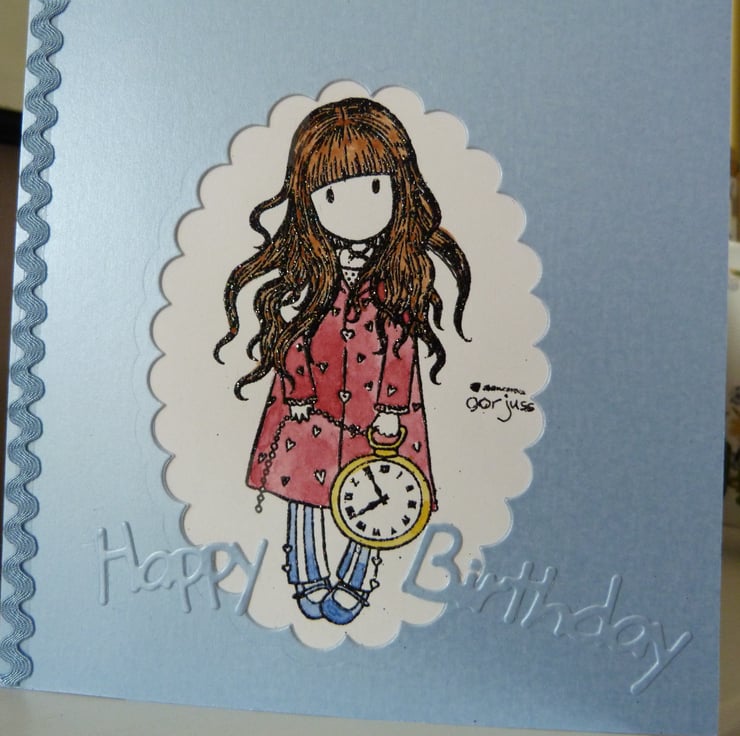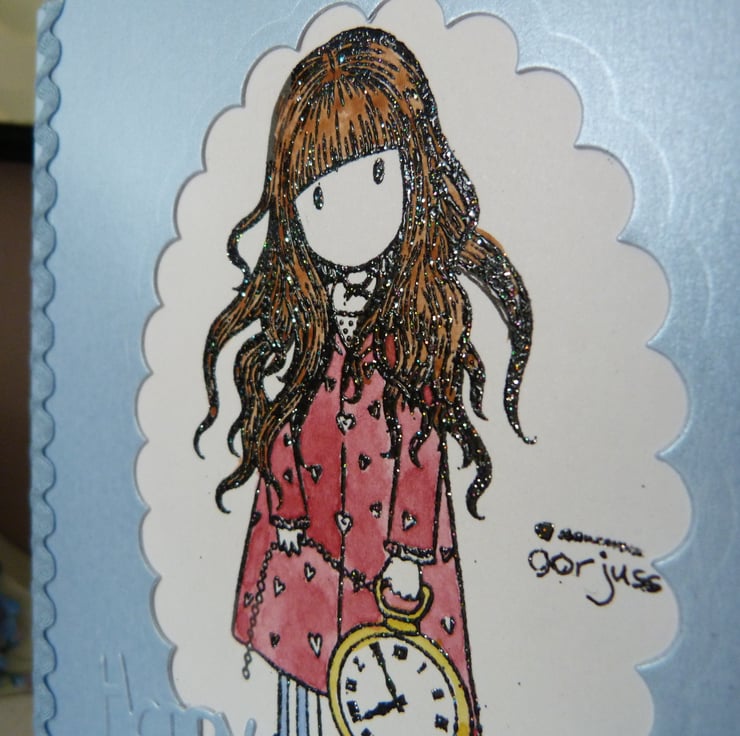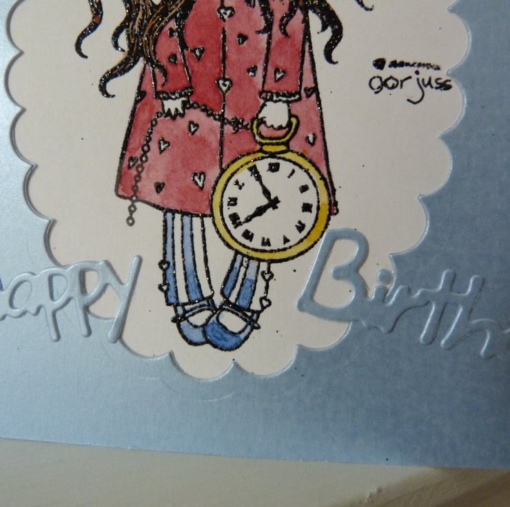 A pretty stamped image by Gorjuss which has been heat embossed onto white card. The image has been water colour painted and inserted into a pretty pale blue pearl quality card. Embellished with Happy Birthday die cut from blue pearl card and finished off with pale blue ric rac braid.