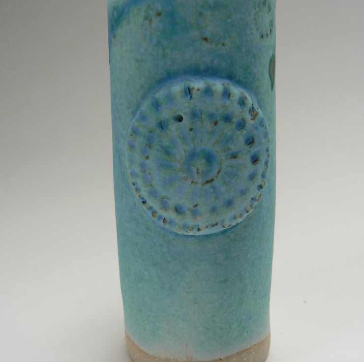 The clay I use fires off white and has small specks of white grog in the body making it quite robust. Outside is glazed in a dry turquoise glaze which highlights the raised decoration, inside there is a clear shiny glaze to make cleaning easier.