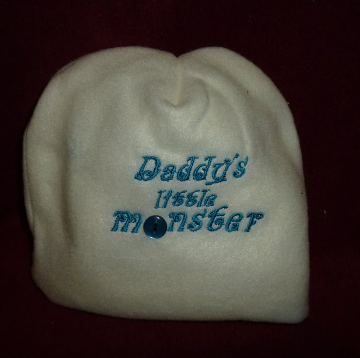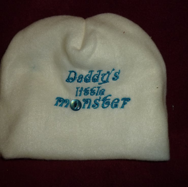 A hat made from a very soft fleecy fabric, cream with a cute embroidered slogan in turquoise.