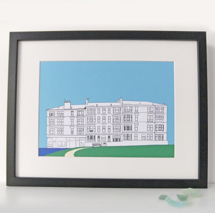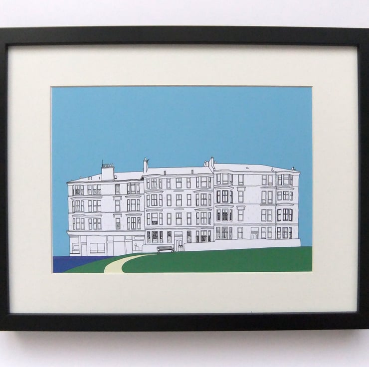 A fabulous print of Glasgow tenements in Scotland with a lovely blue sky! A wonderful piece of art for your home.