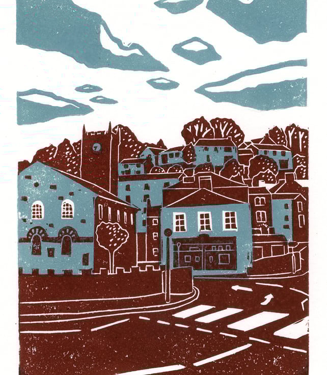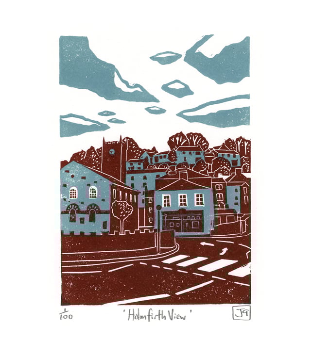 It is just a case of seeing a view that sticks in your head. I was on my travels, saw this view in Holmfirth, and felt the urge to do a linocut of it!