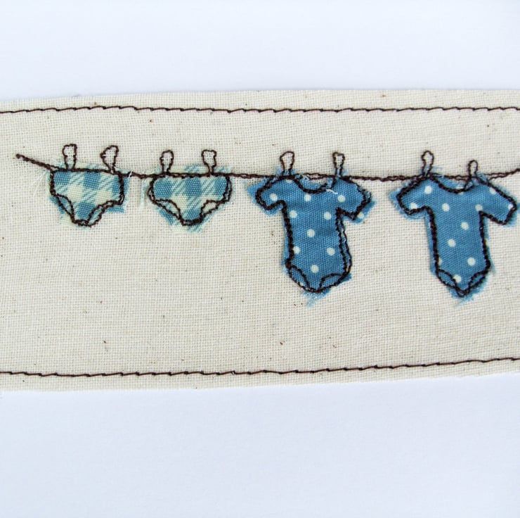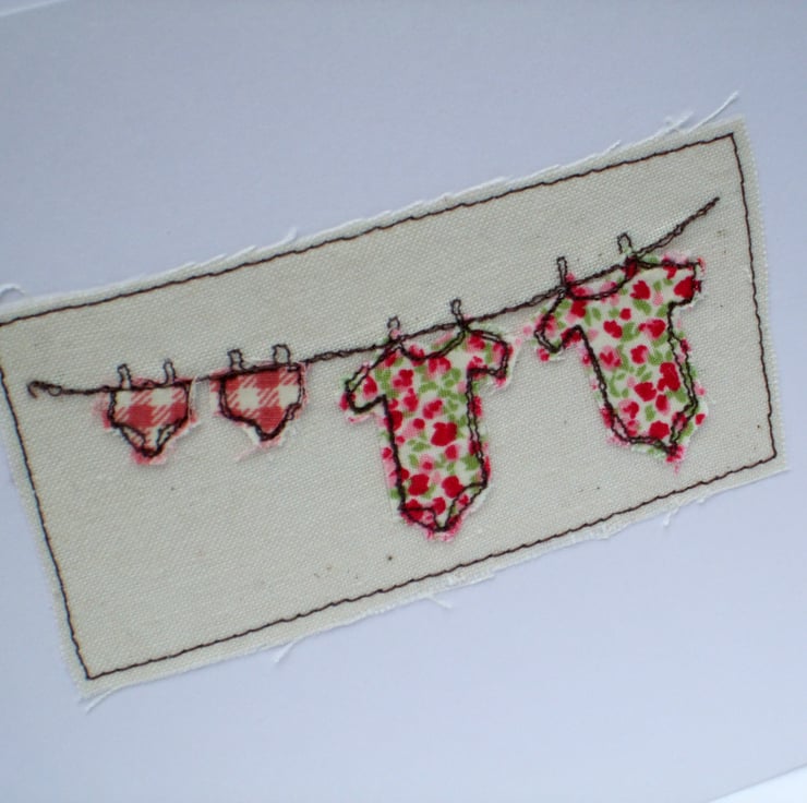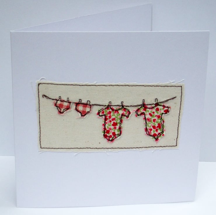 This new baby twins card has been freestyle machine embroidered and makes a lovely and unique card to welcome a new baby twins into the family with two little matching baby vests and knickers. Please let me know if you would like 2 girls, 2 boys or one of each!