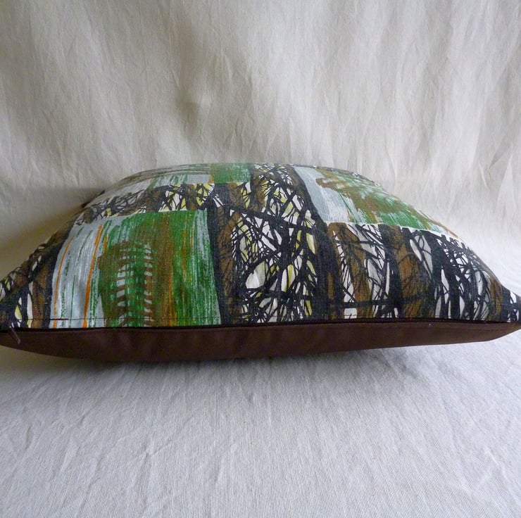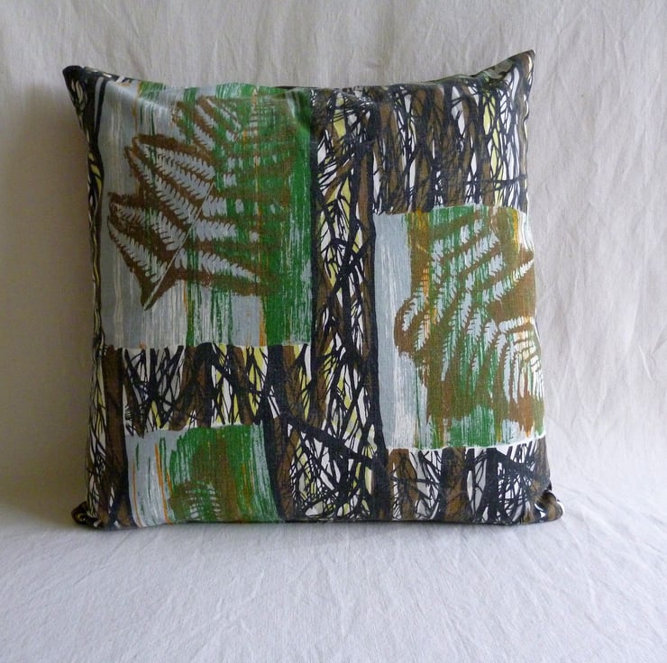 This cushion cover is made from a piece of vintage cotton fabric which has been reclaimed from a curtain. The fabric, which is in very good reclaimed condition, is called Fernwood and was designed by Francis Price in the 1960s. The back of the cushion cover is made from plain brown cotton twill and the cover fastens with a zip at the bottom. The cover is made to a high standard and all internal seams are overlocked for strength.