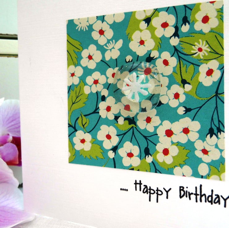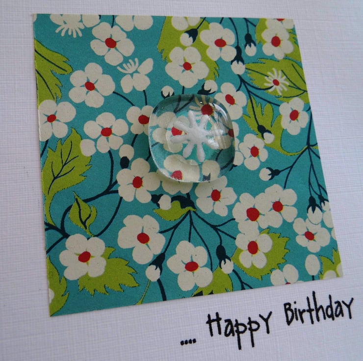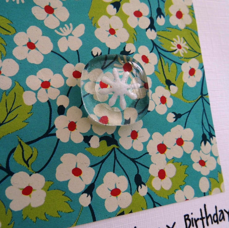this pretty card has a fused glass nugget with a daisy on a liberty print background