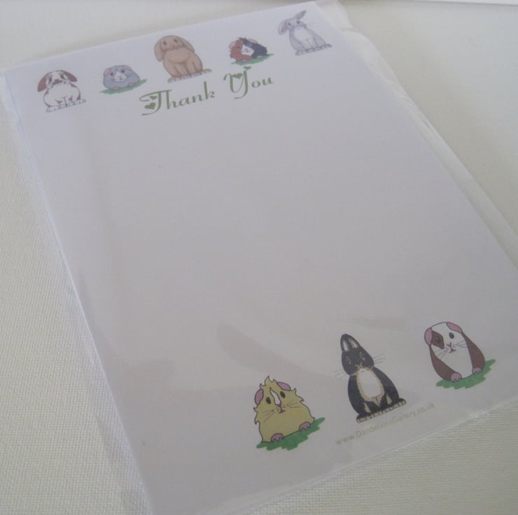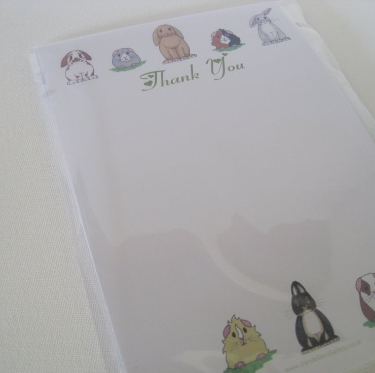 A set of 6 sheets of bunny and guinea pig themed 'Thank You' note paper.