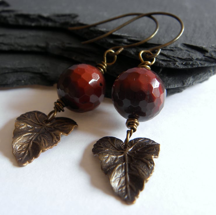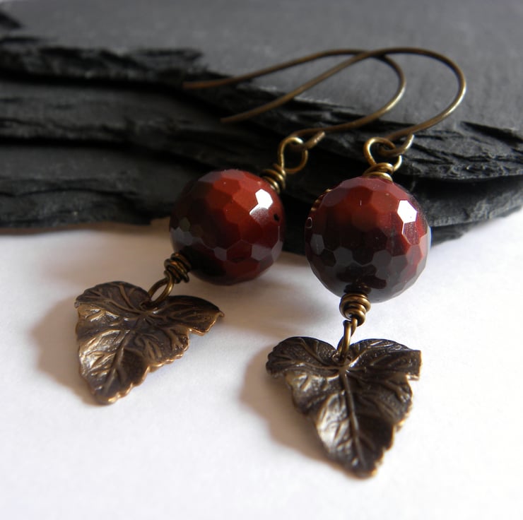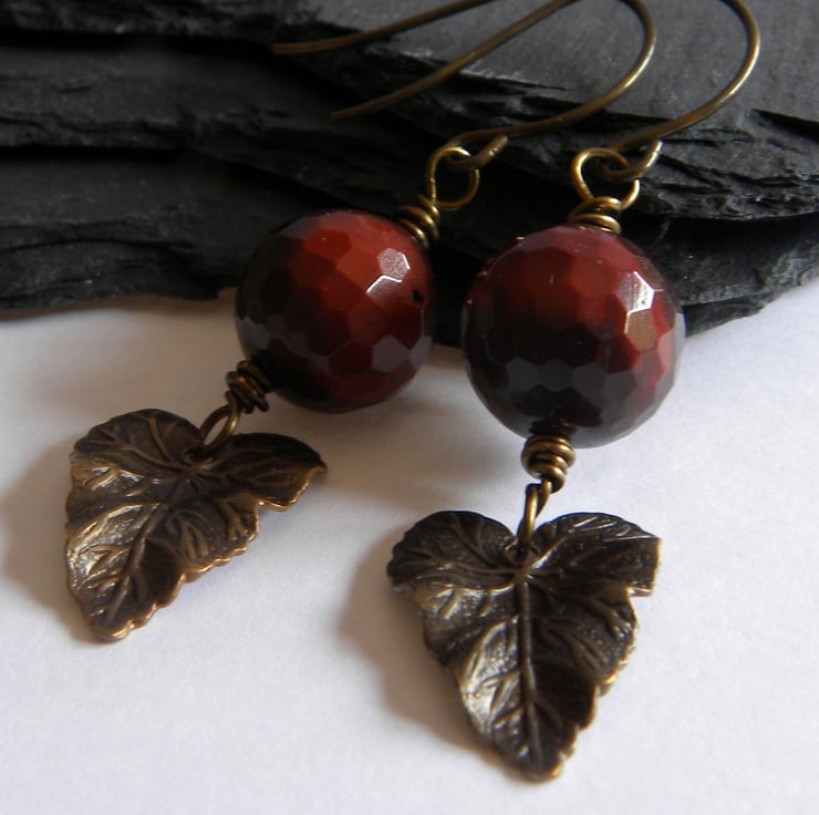 Mookaite gemstone beads are combined with Vintaj natural brass woodland leaf charms to create these lovely earrings.
