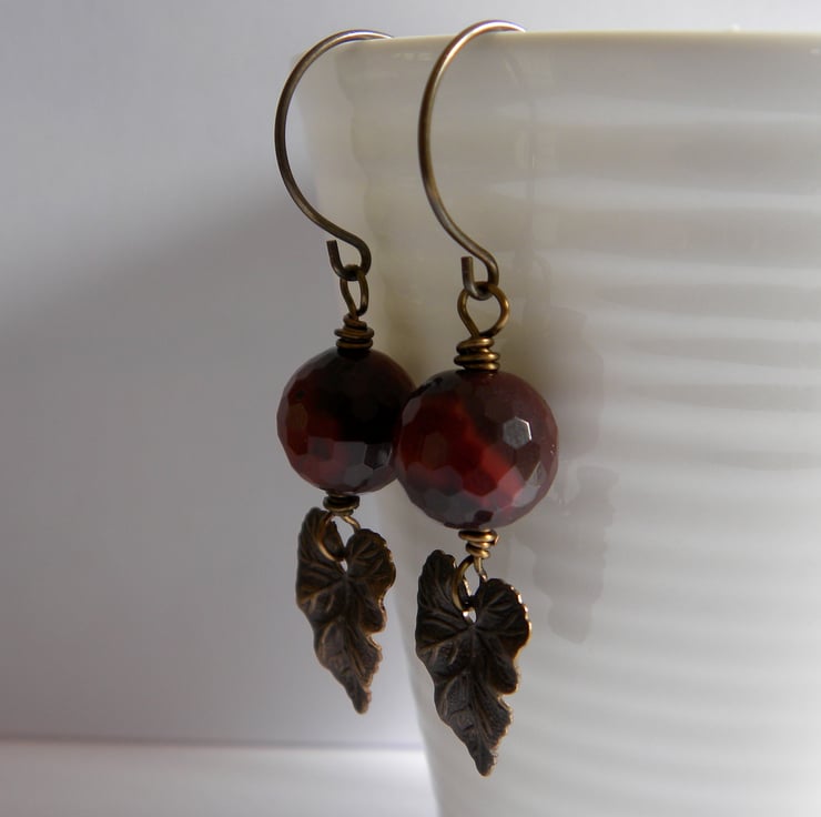 The mookaite are a gorgeous earthy shade of mahogany with hints of brown and black, and are beautifully faceted. The beads dangle simply from hand antiqued round French hook brass earwires.