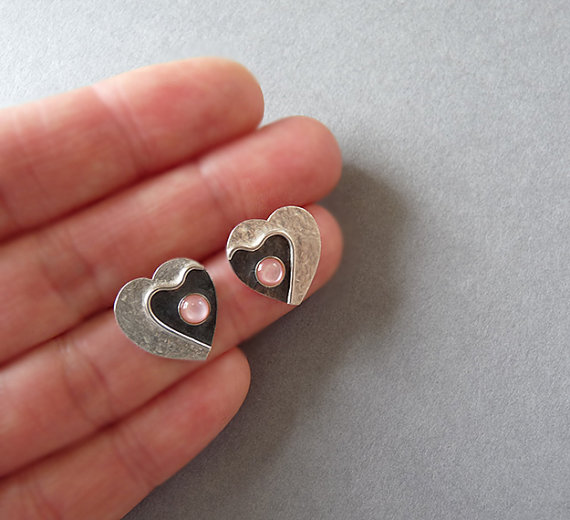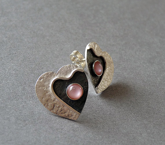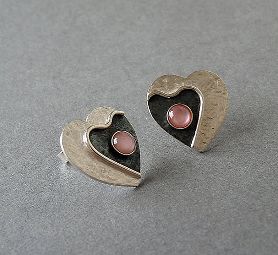 These contemporary heart studs with Pink Mother of Pearl are completely hand made in sterling silver. They have been textured, partially oxidized and polished to a bright and shiny finish. They have sterling silver butterfly backs.