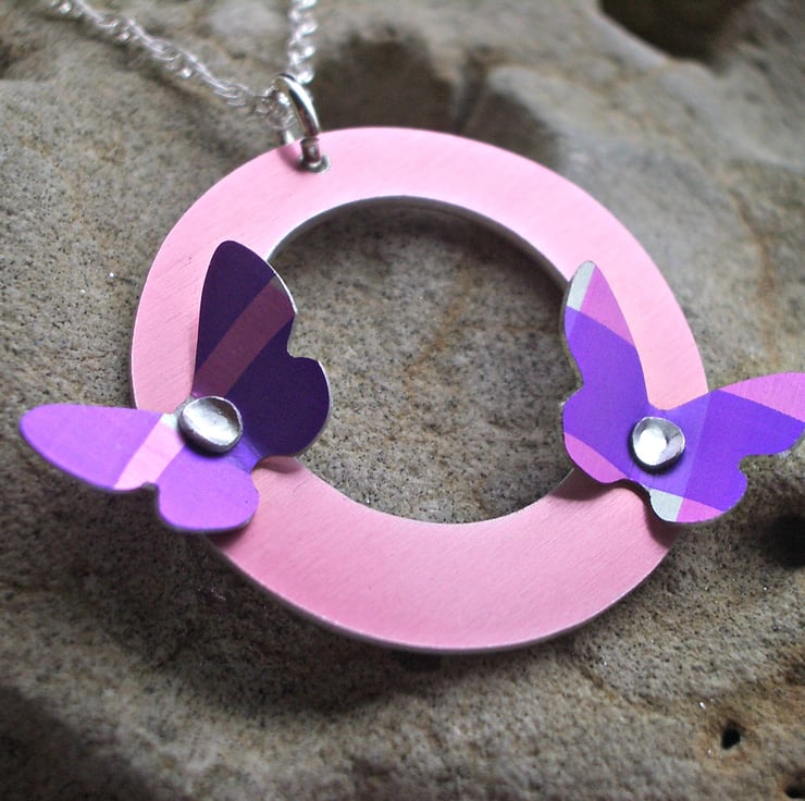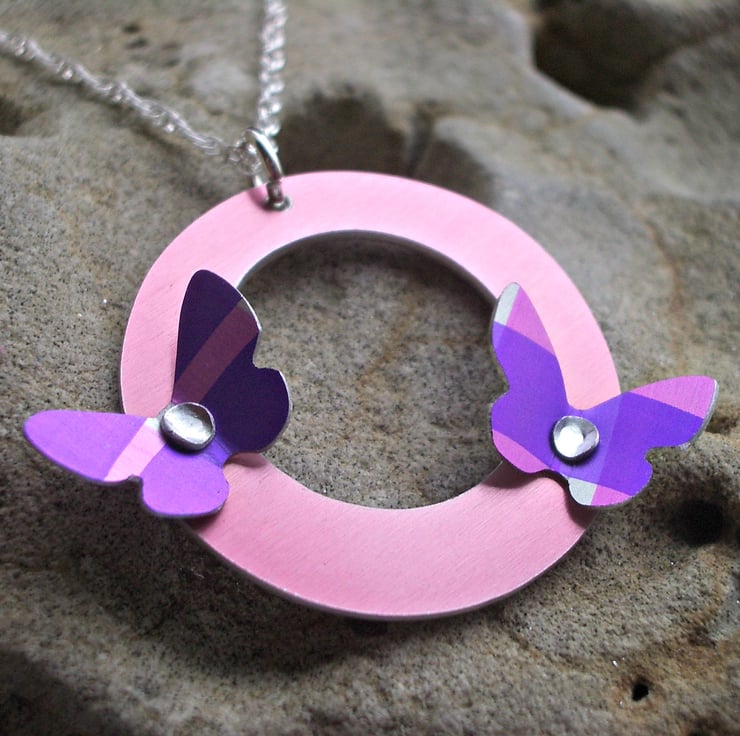 This pendant has been hand made from aluminium which I have dyed and sealed so that the colour becomes a permanent part of the metal. I saw pierced the circle by hand and added two coordinating aluminium butterflies using hand made rivets. The wings have been angled slightly so that they catch the light. The circle which has a brushed aluminium appearance on the reverse, dangles from a sterling silver 16" chain.