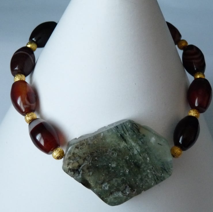 It has been made with a single 35 x 30mm prehnite slab, 12mm fancy agate ovals and 4mm gold stardust beads. It has been made with clear jewellery elastic, so will fit most wrist size.