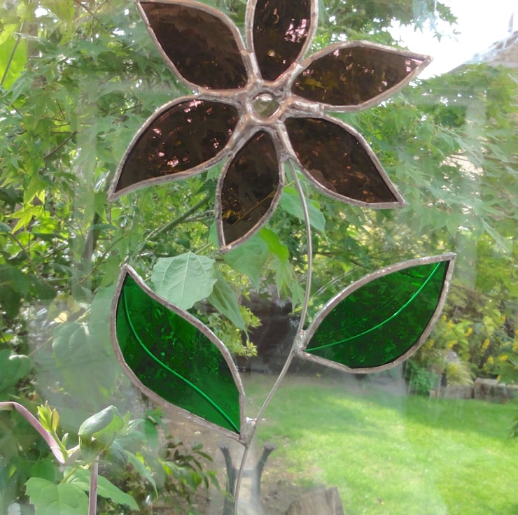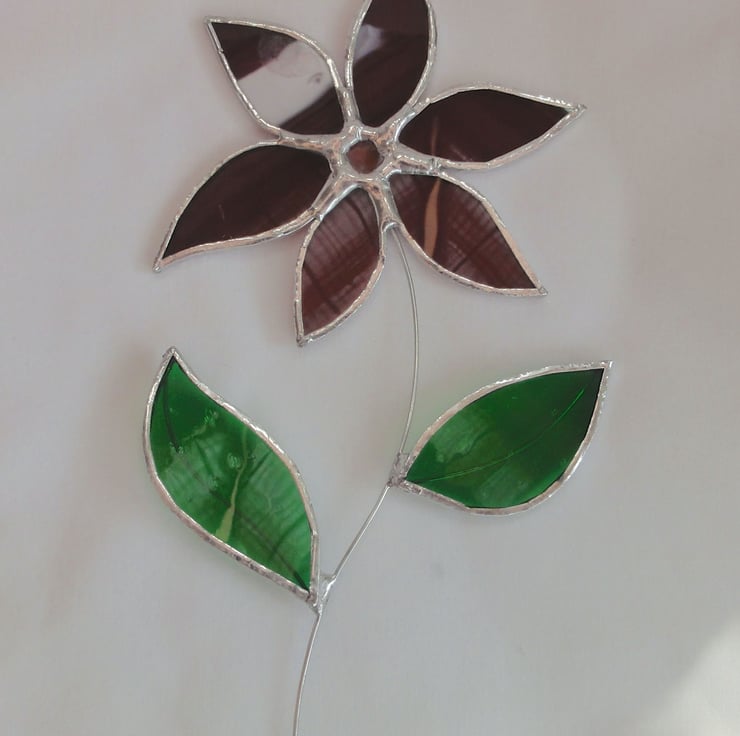 The glass used in this suncatcher is dark rose pink textured glass and pink stained glass for the flower and green glass with bubble inclusions for the leaves.