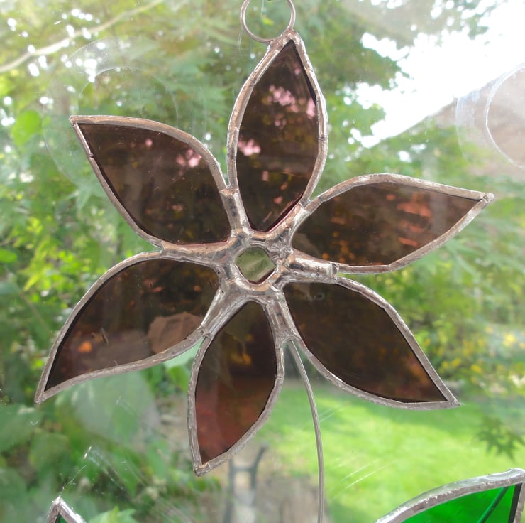 Each piece of glass has been copper foiled and soldered together, tinned wire has been used for the stem. A ring has been attached for hanging purposes. I will supply one good quality window hook with each sun catcher so that you are able to hang the suncatcher in the window when received.
