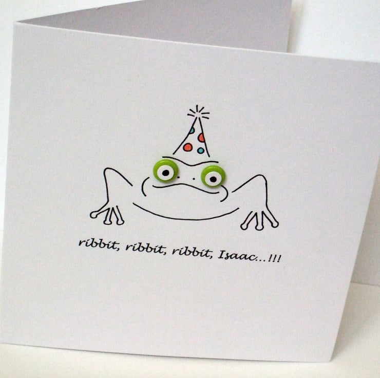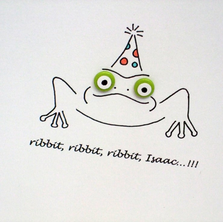 I designed this funny frog card for my nephew Isaac's 7th Birthday! He is too old for tractors and button cars, but thought this would make him giggle and he will love the fact that his name is on it! I thought I should add a party hat on the frog to make it clear what the frog is saying in froggy language. It is clear, isn't it?!