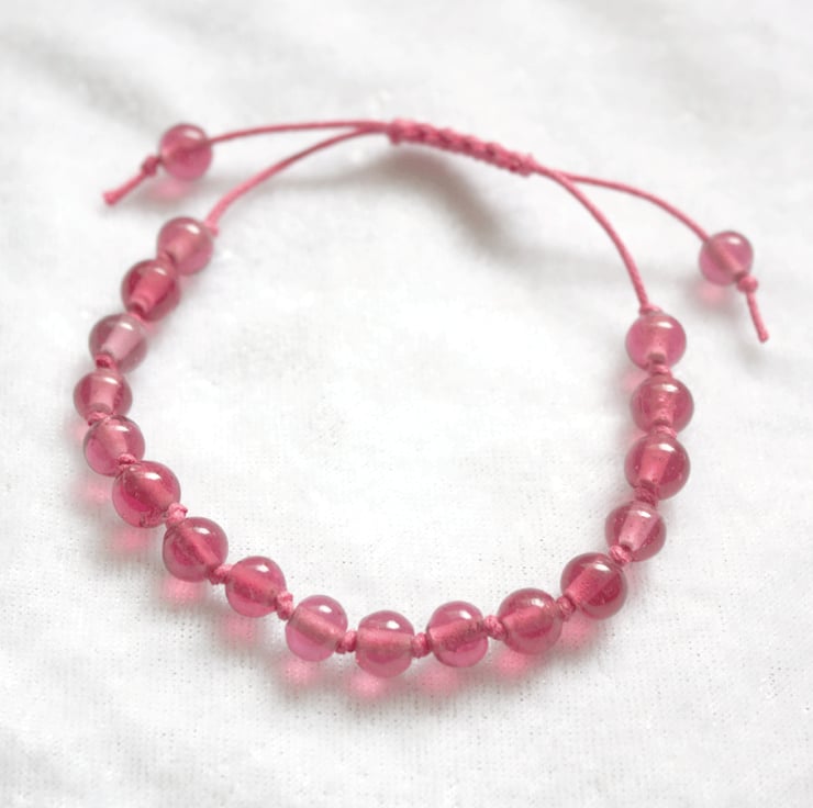 This macrame style bracelet has been made in bright pink waxed cord with 8mm pink Indian glass beads. This bracelet is adjustable, suitable for a small wrist up to a larger wrist size.