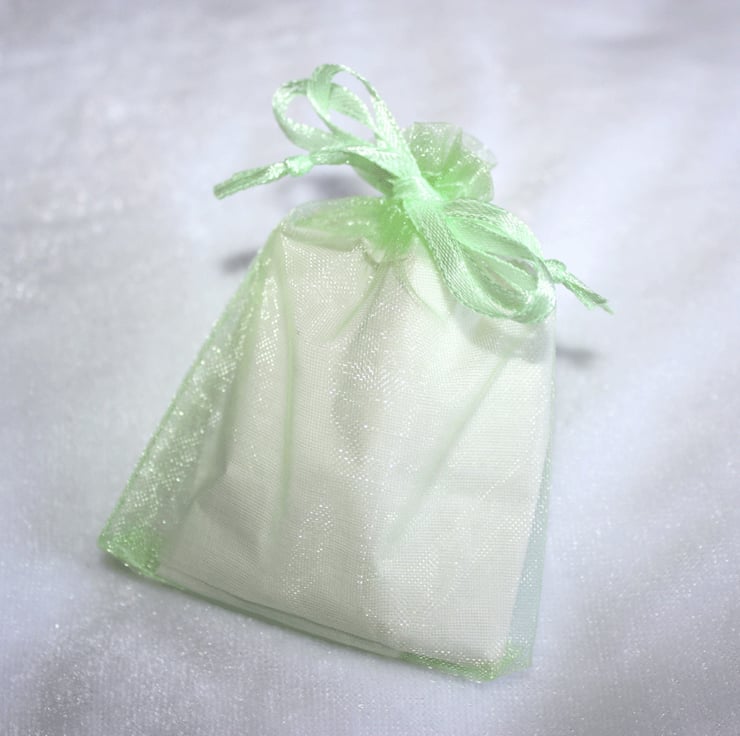 Wrapped in white tissue paper and presented in a lime green organza drawstring bag.