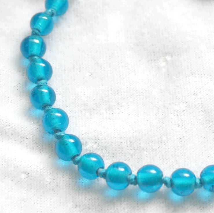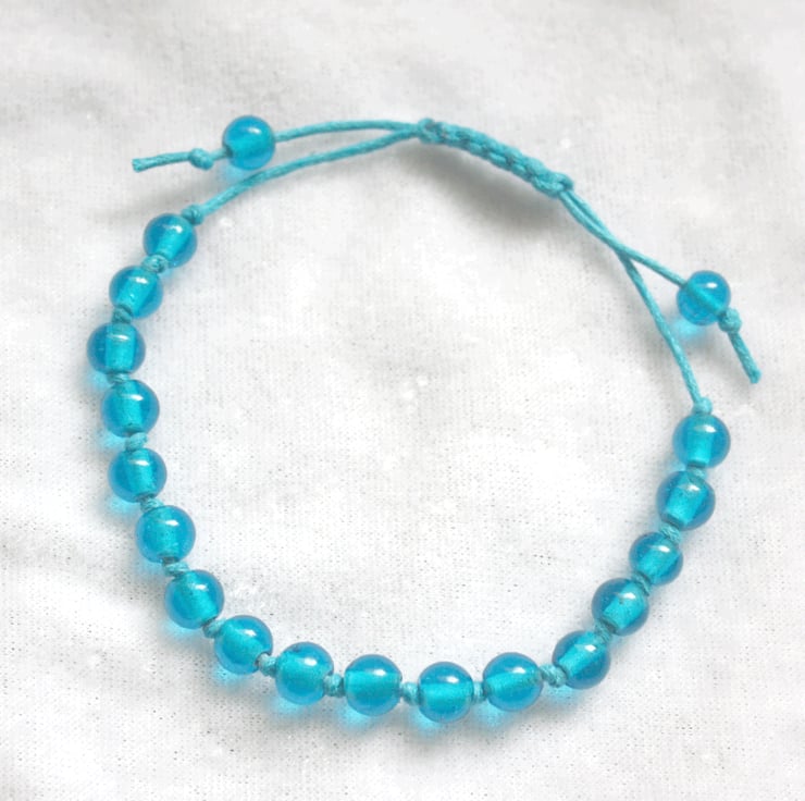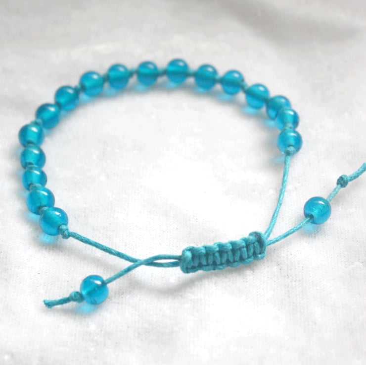 This macrame style bracelet has been made in turquoise blue waxed cord with 8mm turquoise blue Indian glass beads. This bracelet is adjustable, suitable for a small wrist up to a larger wrist size.