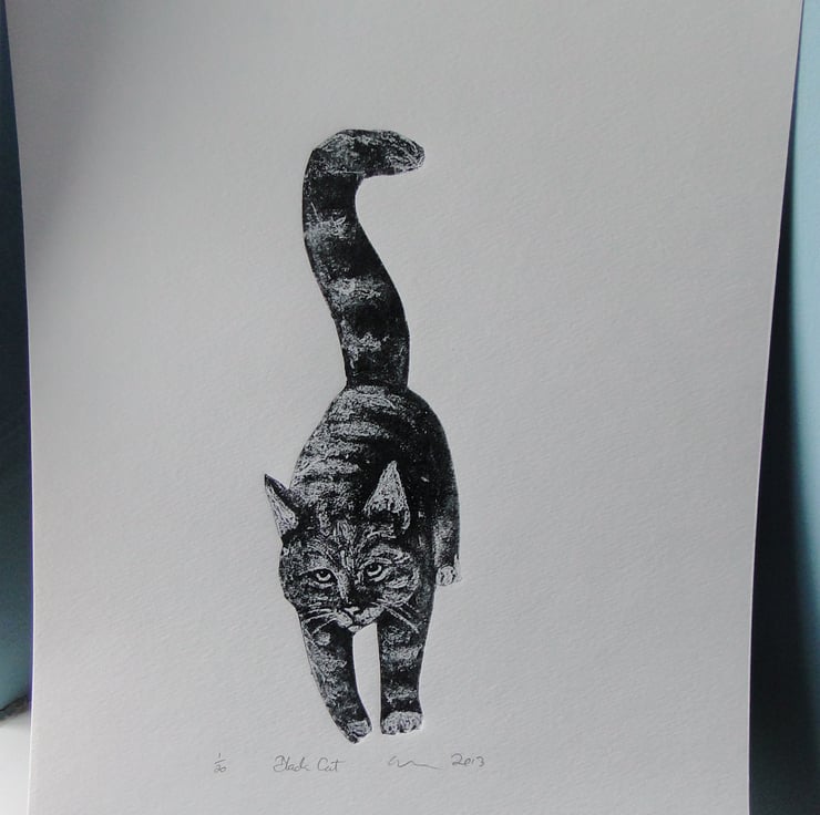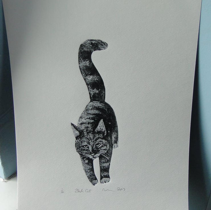 Hand printed on 300gm acid free watercolour paper in blue/black oil based ink.