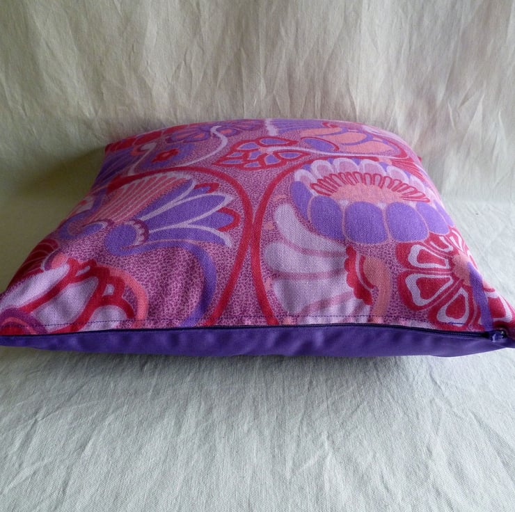 This cushion cover is made from a piece of unused vintage fabric called "Airs and Graces" designed by Jenny Ayres for Moygashel and features an vibrant design in shades of pink and purple and dates from the 1960 or early 1970s. The back of the cushion cover is made from plain purple cotton twill and the cover fastens with a zip at the bottom. The cover is made to a high standard and all internal seams are overlocked for strength.