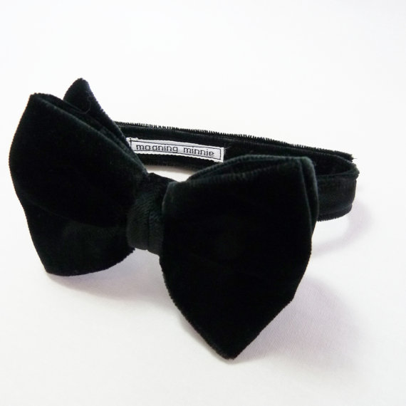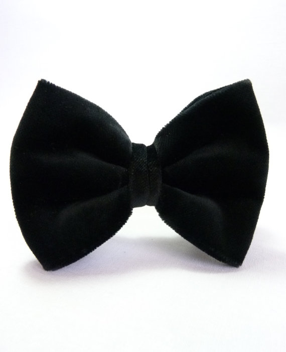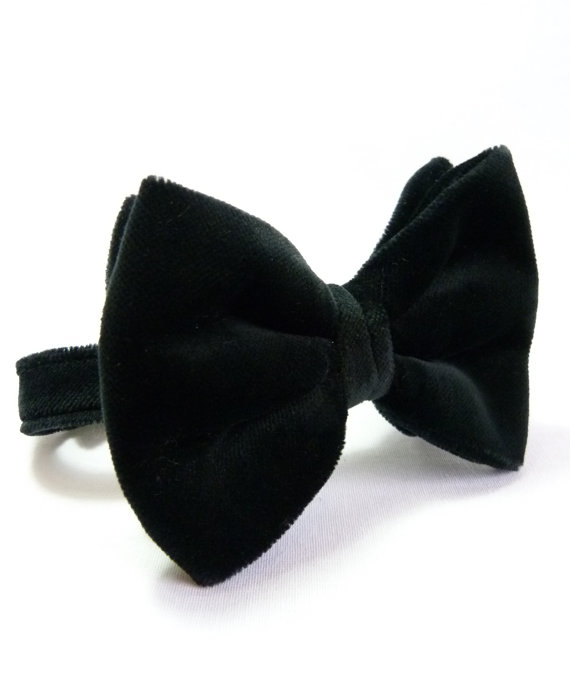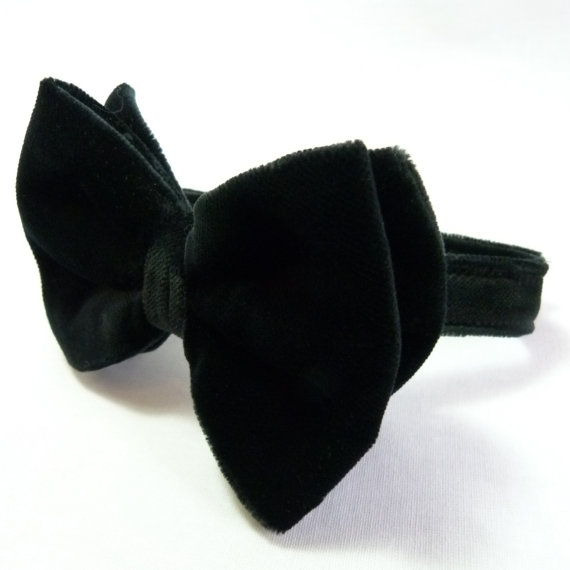 Bow ties are cool, fact. A super awesome mens accessory handmade from the finest black cotton velvet. Unlike most pretied bows this tie features a double bow and gives a true impression of a one piece bow tie. A simple velcro fastening makes it incredibly easy to fit and wear. The bow is oversized and larger than the average bow tie - measures approx 3.5" high x 5" wide. How retro!