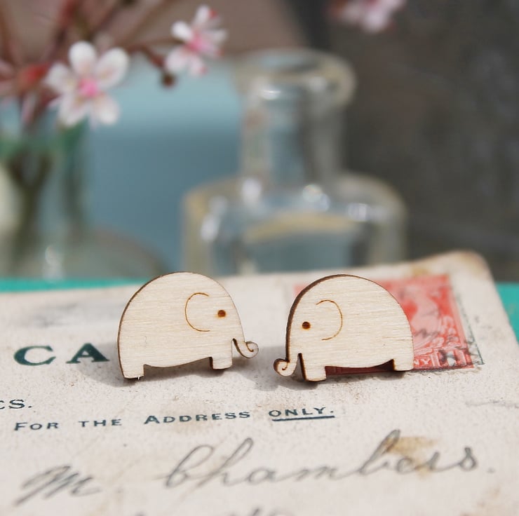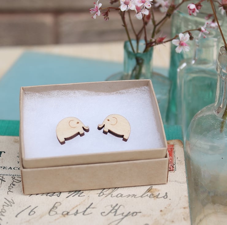 These wooden elephant earrings have been laser cut from 3mm birch plywood are glued securely to hypoallergenic surgical steel (nickel free) earring posts which are safe for sensitive ears and do not tarnish. The earrings close with a butterfly back and are coated in wood oil to protect the wood and give it a beautiful finish. The wood is FSC certified meaning it's environmentally friendly!