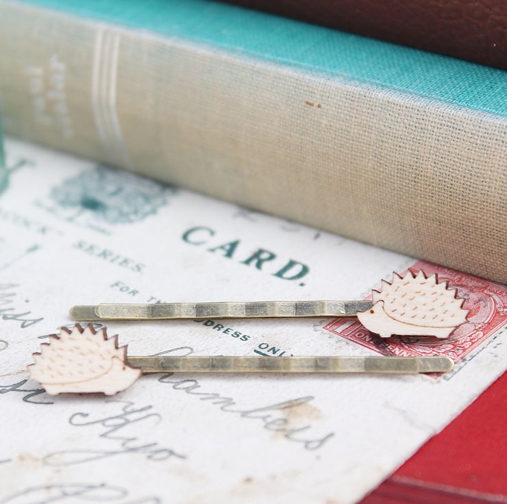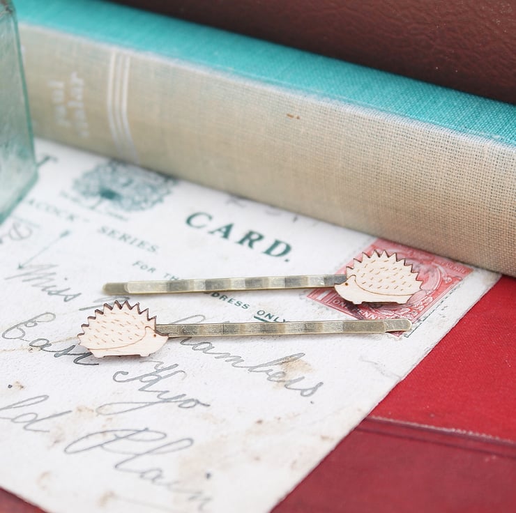 This pair of hedgehog hair grips feature two laser cut hedgehogs glued securely to antique gold plated hair grips. The hedgehogs are laser cut from 3mm birch plywood and have been coated in wood oil to protect the wood and give it a lovely finish. The wood comes from a natural source and is FSC certified meaning it's environmentally friendly.