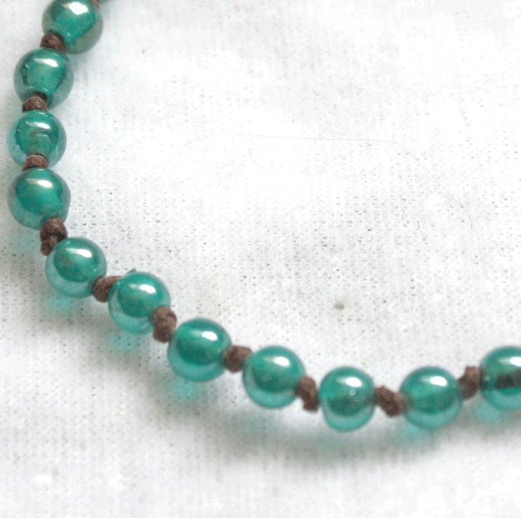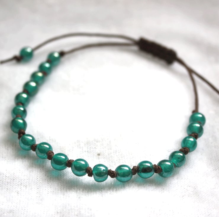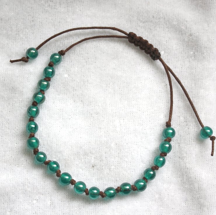 This macrame style bracelet has been made in dark brown cord with 5mm aqua Indian glass beads. This bracelet is adjustable, suitable for a small wrist up to a larger wrist size.