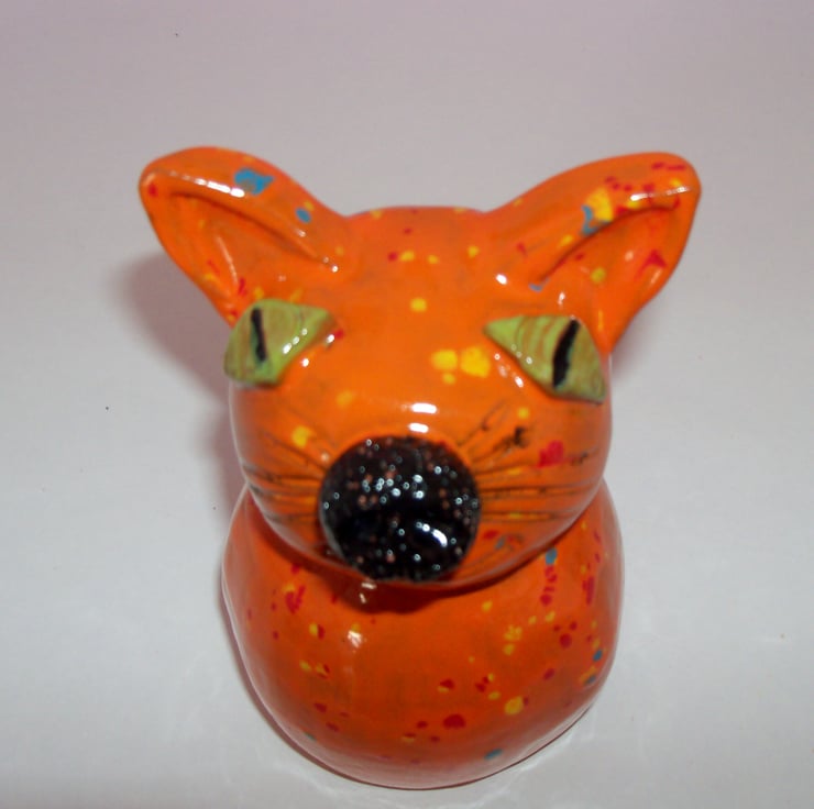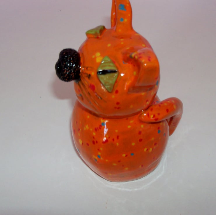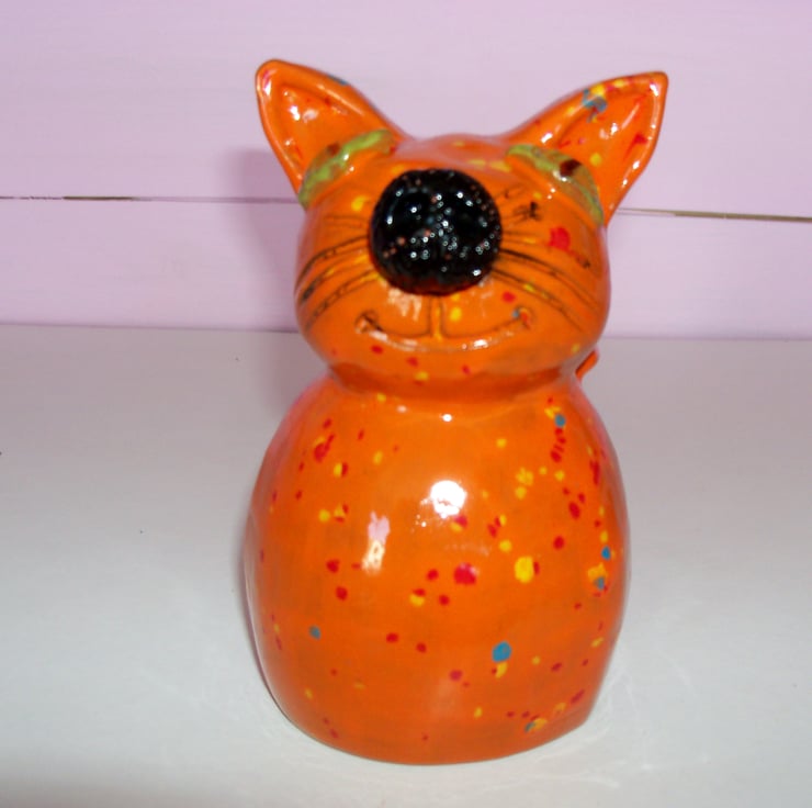 Loveyl comical Orange Glazed Speckled with Reds, Greens, Yellow and Blue Made with Red Terracotta Cat. He is a character and will be out and about - not a stay at home cat. Indoor or Outdoor. 1lb 6 oz; 6"H x 4"W. Postage to UK but will consider rest of world on application.