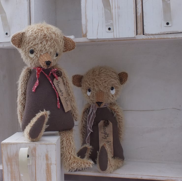 Made from mohair with a heavy wool felt body and foot pads. The eyes are glass boot button style and nose and mouth are embroidered. Overall she measures 32 cms and is about 22cms. sitting. Her name label is free machine embroidered on coffee dyed felt and attached to her body with a rusty safety pin and bell.