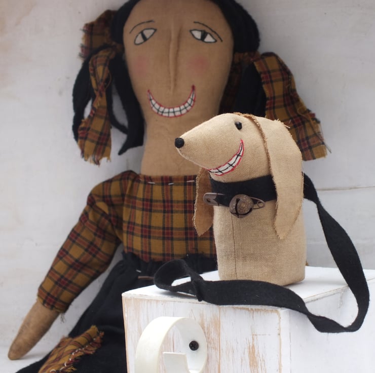 This primitive doll is 'Walking the Dog' very happily with a very happy dog.
