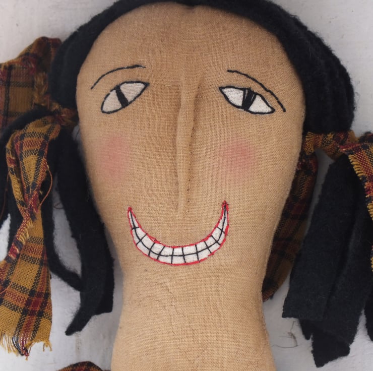 They are made from coffee and cinnamon dyed linen, sanded back for a worn ,aged appearance . She has boiled wool hair,a needle sculpted nose and embroidered features.Her skirt is wool and her blouse is Indian woven cotton. The skirt is finished with a rusty bell and safety pin.The little dog has an embroidered mouth and nose, glass bead eyes, a felt collar and lead and that is finished with a rusty bell and safety pin. He is also free standing with the base filled with rice.