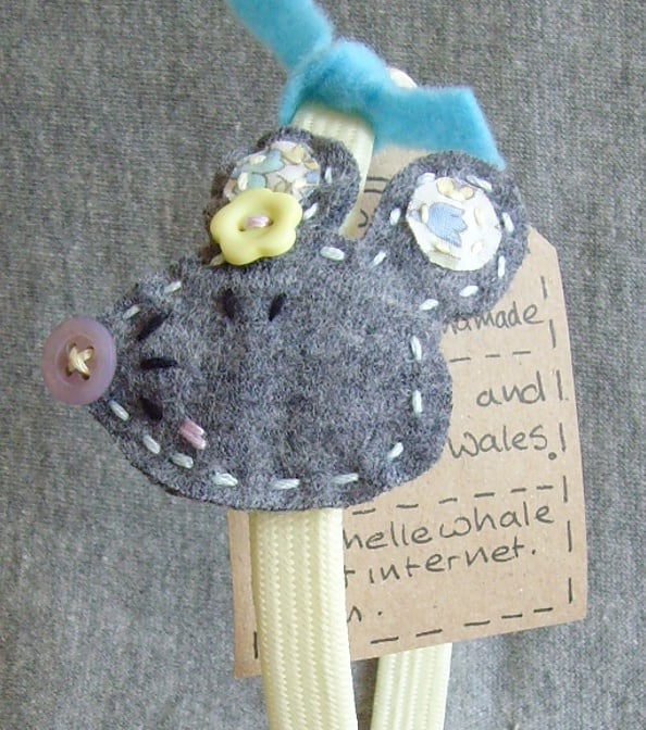 The mouse is hand cut from good quality felt and cotton fabric for the ears. It is all hand stiched and finished off with a vintage button for the nose and a flower button od the ear.