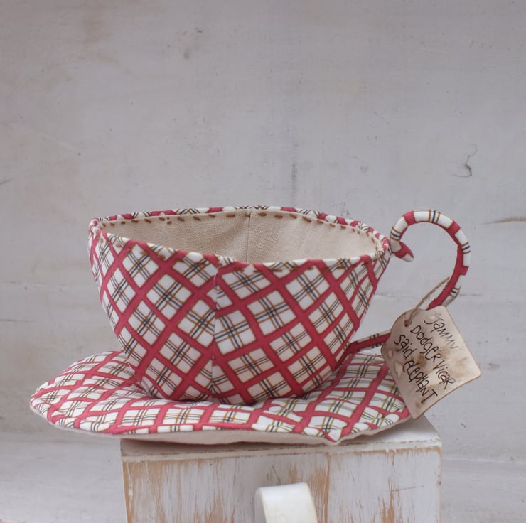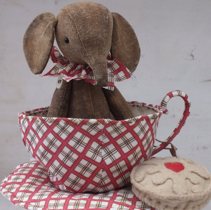 Ellie in a Teacup - the teacup is made from poplin, lined with natural coloured linen . The rim of the cup has been stitched using embroidery thread and is also wired, as has the curly cup handle.The saucer contains wadding to give it a bit more substance.Tied to the cup handle is a coffee stained label with 'Jammy Dodger, Vicar ? Said elephant ' hand written in Indian ink.. ( or your own short message ) .